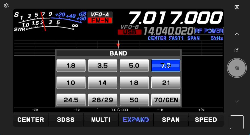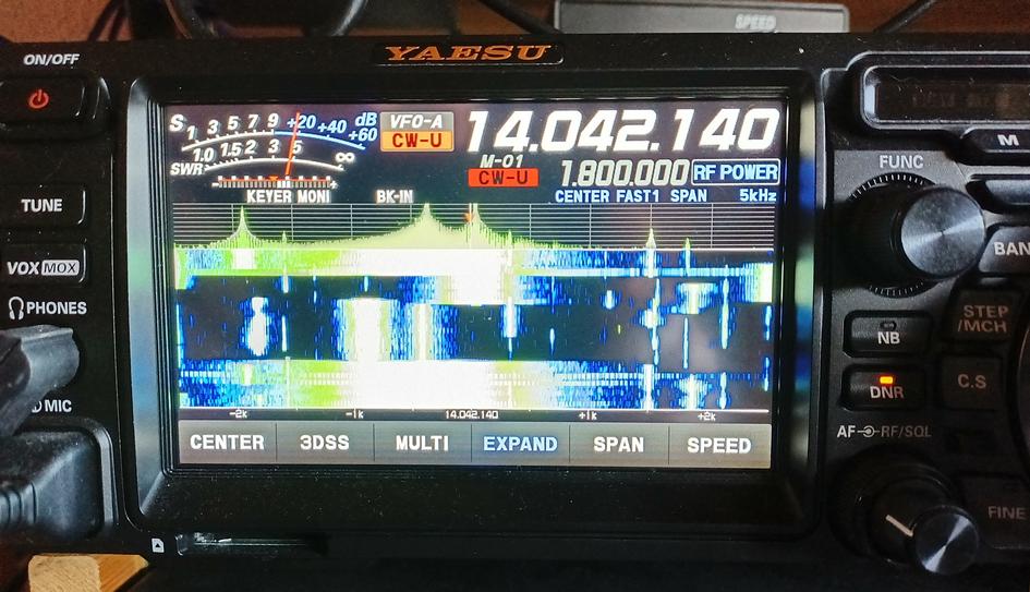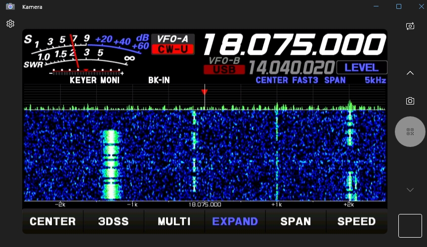 Die übrigen Einstellungen betreffen: die Farbmischung, die Helligkeit, die dargestellte Bandbreite und die Laufgeschwindigkeit. Im Bild sehen wir die Farbmischung blau-grün, es werden 5 kHz dargestellt und die Geschwindigkeit ist so gewählt, dass man auch schnelle CW-Signale klar von Trägern unterscheiden kann. Die Bandbreite kann man von 1 kHz bis zu stolzen 1 MHz wählen und sich so schnell einen Überblick über ein ganzes Band verschaffen. Am häufigsten muss die Helligkeit „Level“ angepasst werden. Sie ist von den jeweiligen Bedingungen aber auch von der gewählten Bandbreite abhängig. Der Regelbereich geht von -30 bis +30 dB. Verglichen mit dem TS-890 ist die Darstellung etwas unruhiger und könnte eine Glättung vertragen.