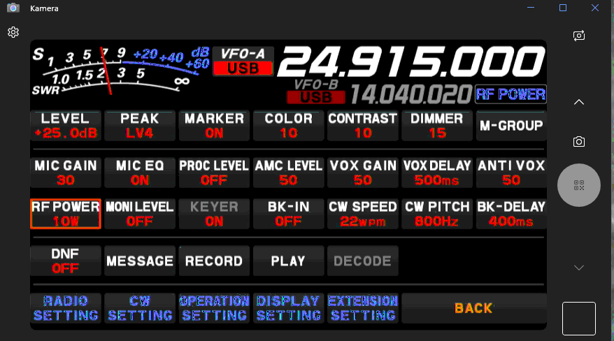 Unten sehen wir 8 Slider. Davon sind 5 belegt. Damit können Ausgangsleistung, Lautstärke und Displayeigenschaften per Schieberegler bequem eingestellt werden. Insgesamt können 32 Kommandofolgen definiert werden. Das genügt, um den FT-DX10 vom Einschalten (F5)