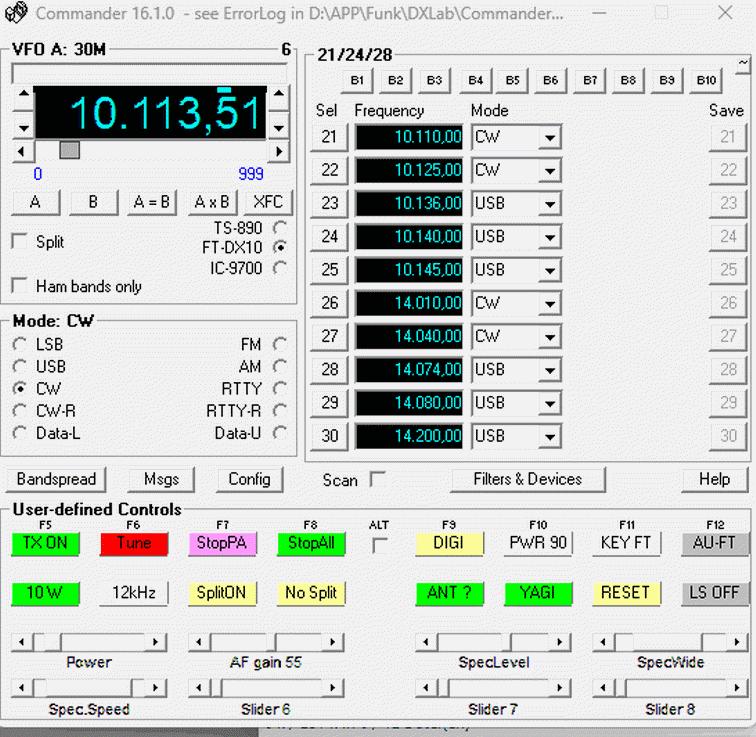 Im oberen Teil sieht man die Funktionen, die der DXLab-Commander bereitstellt. Unter „User defined Controls“ befinden sich die eigenen Kommandosequenzen. Diese beziehen sich nicht alle auf den FT-DX10. Der mit „Yagi“ beschriftete Button kann z.B. die Antenne für den vielleicht ebenfalls laufenden IC-9700 einstellen oder kann ihm über F11 auch den Keyer oder mit F12 den Audioeingang übereignen. Der Mode-Button F9 steht momentan auf „DIGI“ und wechselt beim Anklicken jeweils auf den nächsten Modus, d.h. die Buttons zeigen in ihrer Beschriftung die aktuelle Einstellung.