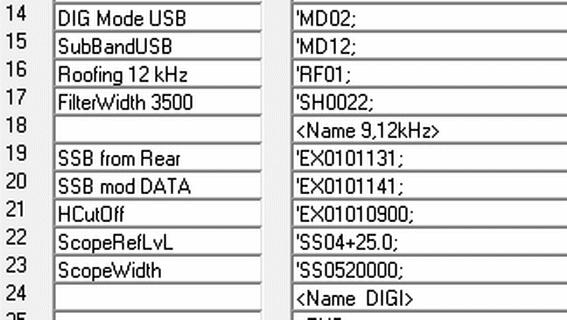 Da ich auch Digitalbetrieb mit dem TS-890 in USB durchführe, habe ich auch den FT-DX10 entsprechend eingerichtet. Somit kann ich die 100 Speicherplätze für Frequenz und Modus des DXLab für beide Transceiver nutzen. Für die 4 benötigten Modi CW, DIGI, LSB und USB habe ich eine DXLab-Kommandosequenz aufgebaut, die jeden Modus entsprechend konfiguriert. Im folgenden ein Auszug aus der Kommandofolge für den Mode DIGI: