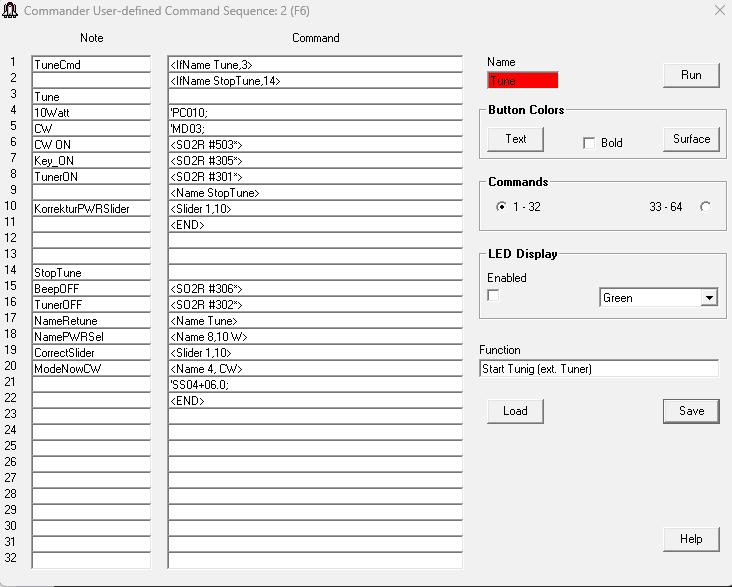 Beim TS-890 gibt es ein Kommando „Abstimmen mit verringerter Leistung“. Für den FT-DX10 muss man die einzelnen Schritte selbst starten. Der Ablauf beim Starten der Abstimmung ist: Leistung 10W und Modus CW einstellen. Dann mit SO2R-Kommandos über die selbstgebaute Steuerung den Keyer aktivieren, einen Dauerton erzeugen und den LDG-Tuner starten. Der entsprechende Button auf der Oberfläche wechselt von „Tune“ zu „StopTune“. Ist der Tuner mit der Abstimmung fertig und das Ergebnis gut, klickt man den Button nochmal an und der Abstimmvorgang wird beendet. Der FT-DX10 verbleibt im CW-Modus mit 10 W, die entsprechenden Buttons und der Power-Slider werden auf diese Werte korrigiert. War ein anderer Modus gewünscht muss dieser Modus und die benötigte Leistung eingestellt werden.