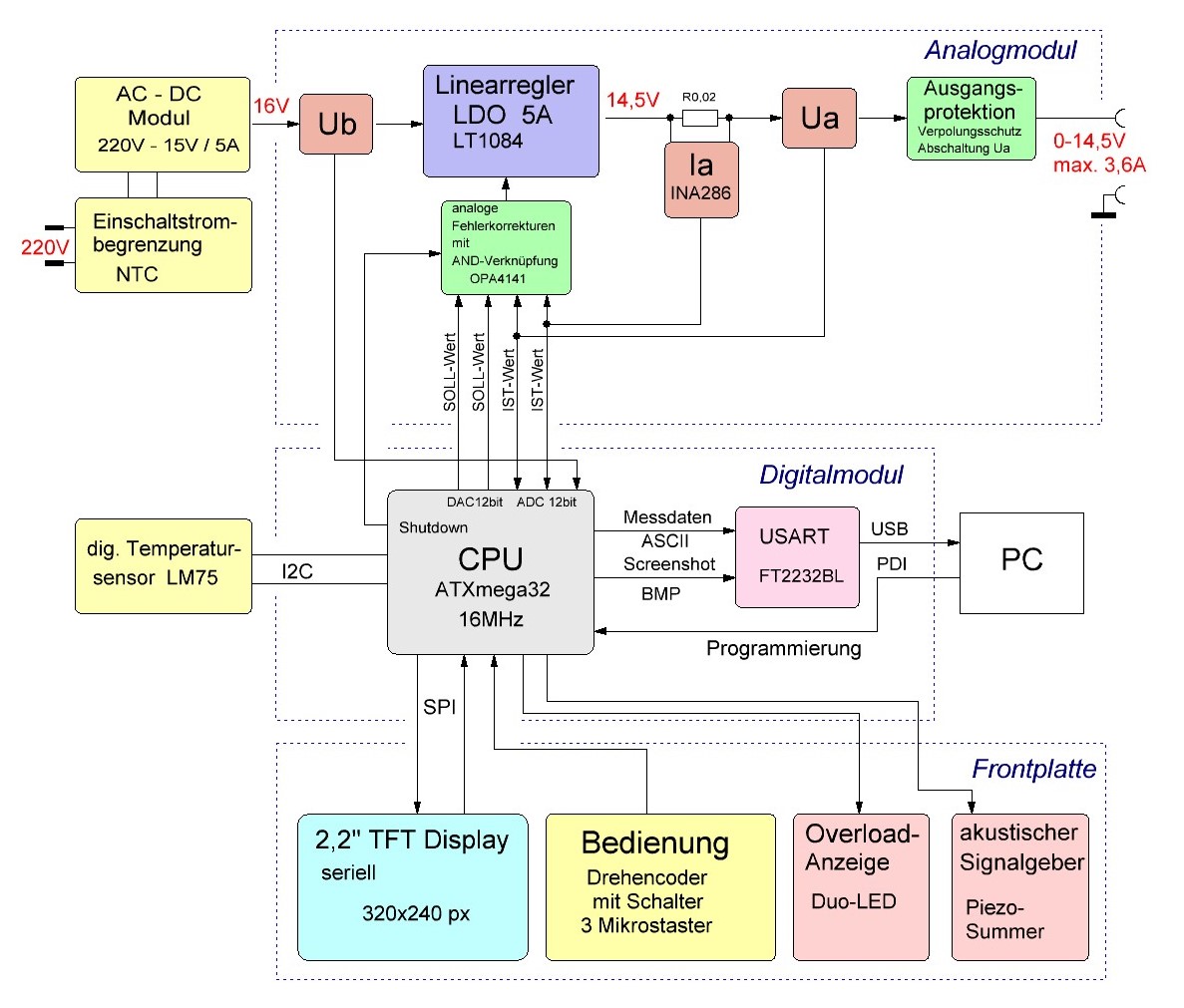 Das Endergebnis ist im Blockschaltbild zusammengefasst, in dem alle wesentlichen Komponenten und Funktionen des Netzgerätes dargestellt sind.