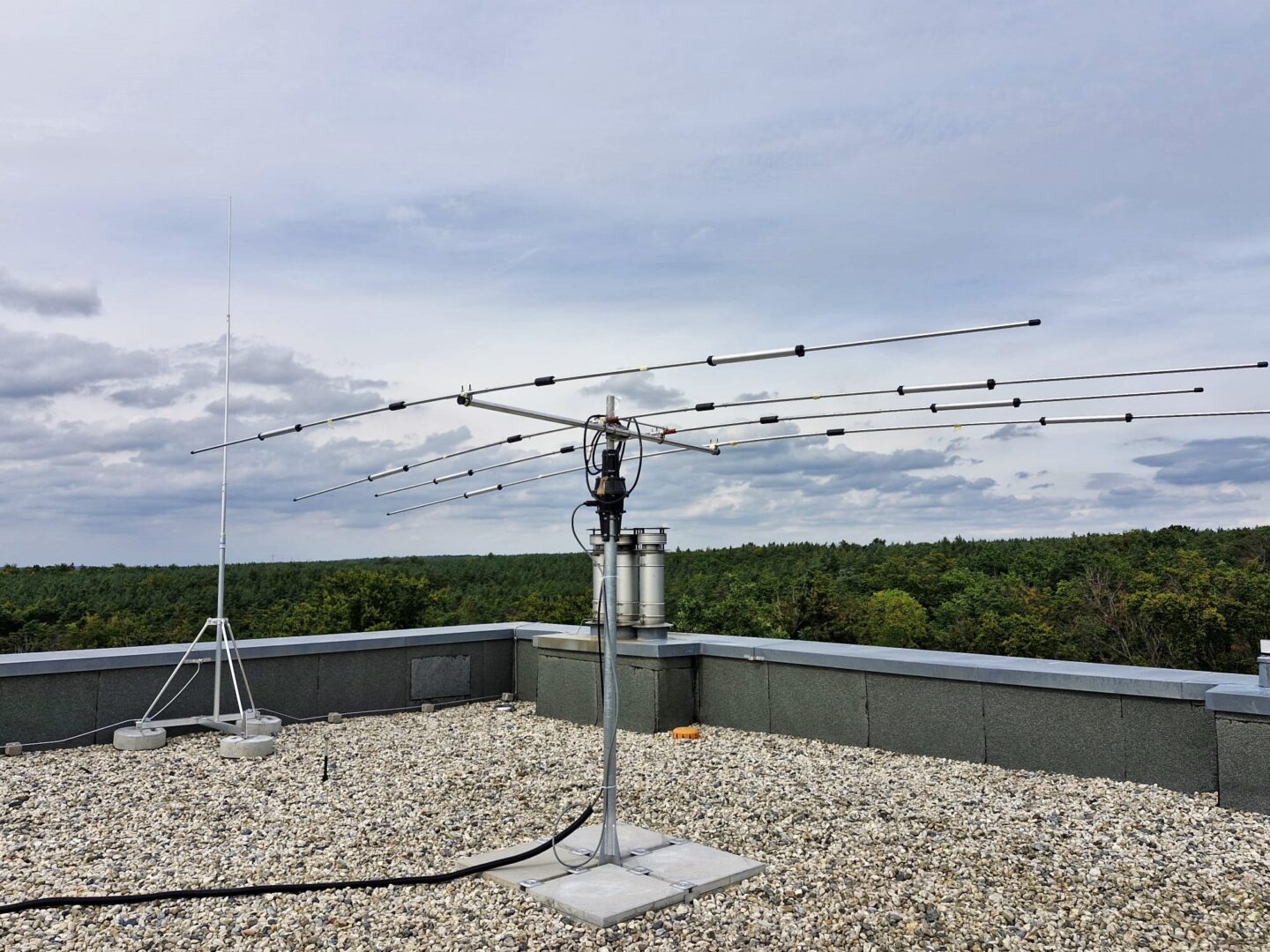 Nach dem Umzug in eine Apartmentwohnung stand ein Stockwerk höher ein Flachdach zu Verfügung, auf dem ich (DL7HSD) eine Antennenanlage installieren konnte. Es sollten aber keine großen Aufbauten sein, die von der Straße aus gesehen werden konnten. Für einen Dipol war die Fläche zu klein, eine Vertikal wäre zu hoch gewesen, eventuell kam noch eine Magnetloop infrage. Nach einem langen Findungsprozess entschied ich mich für eine Antenne, deren Drehradius für die Dachfläche ausreichte und zudem eine Richtwirkung auf den Nicht-WARC-Bändern hatte. Meine Wahl fiel letztendlich auf die Trap Master Mini-33-AW von Mosley für die KW-Bänder 20m, 17m, 15m, 12m und 10m.